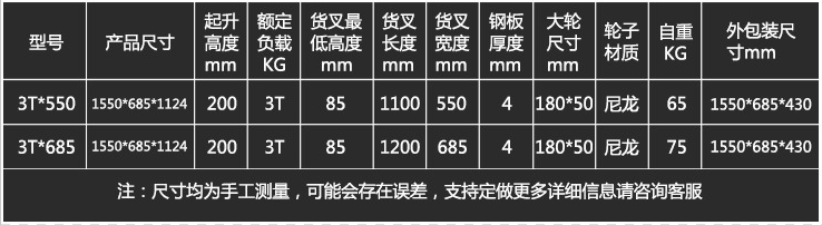 搬運車分為兩種型號:550型和685型,其具體的相關尺寸見上圖所示。其輪子也分為2種,一種是尼龍輪,一種是橡膠輪。尼龍輪適合水泥地面,橡膠輪適合大理石、油漆、環氧地面。